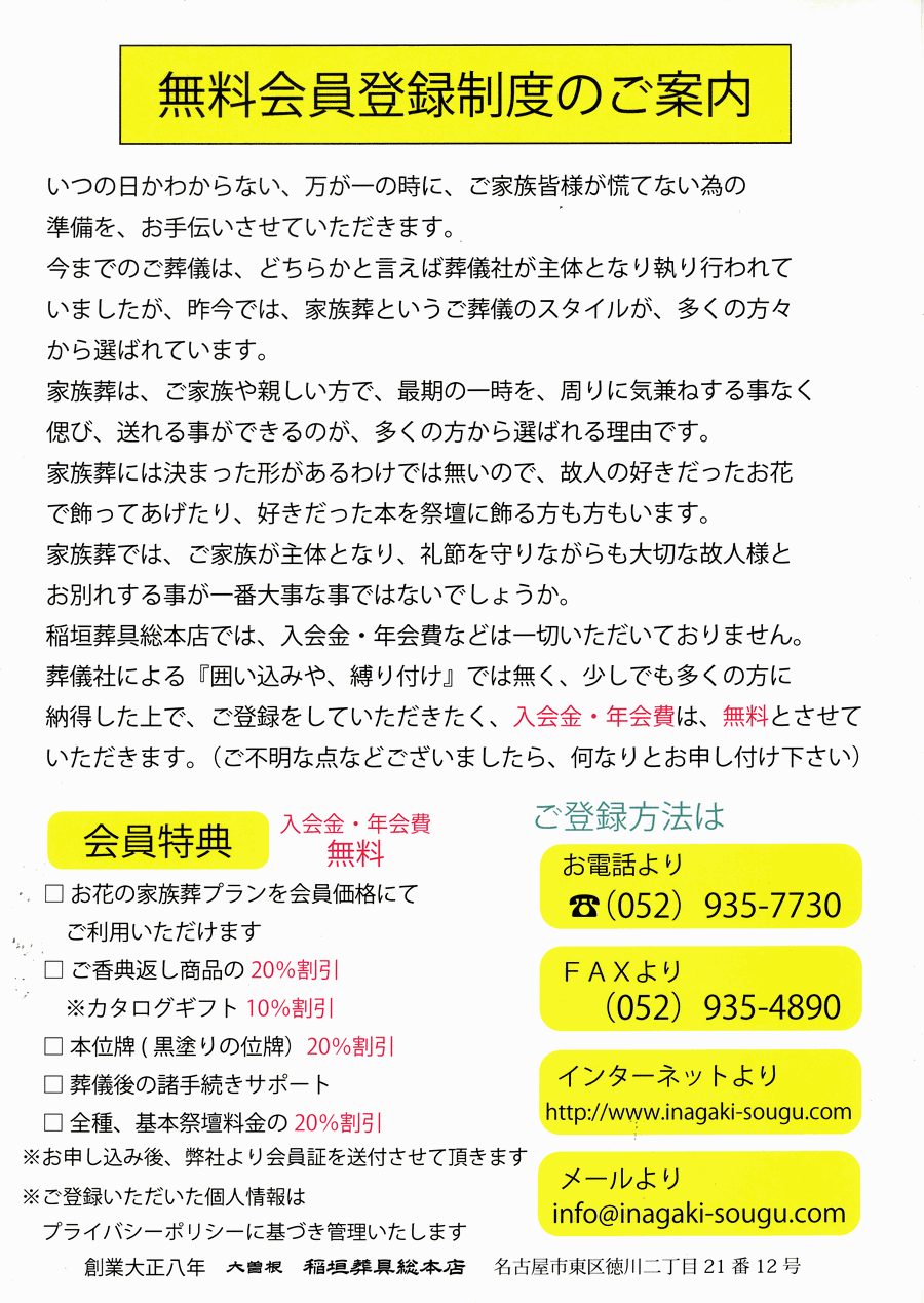名古屋 家族葬 名古屋市東区の家族葬 名古屋市中区の家族葬 家族葬ホール 会員登録 葬儀 お葬式 直葬 火葬式 密葬 無宗教葬 稲垣葬具総本店 愛知県